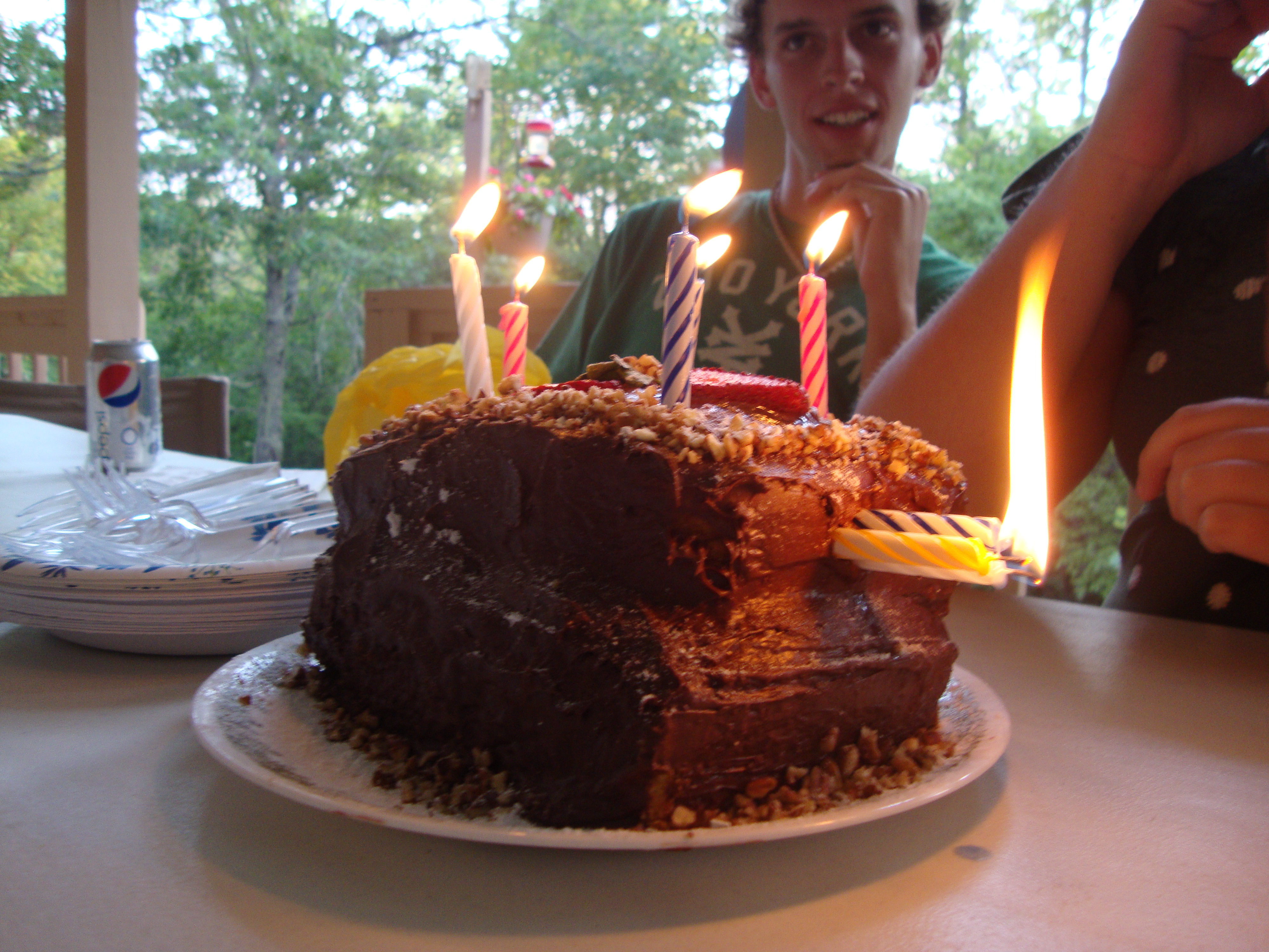 The next day was my birthday and I woke to find Aunt Lin in the kitchen gingerly removing my yellow birthday cake from its perfectly good pan. She cut the dilapidated cake in half and stacked one half on top of the other. Then she began icing this monstrosity with chocolate frosting. This is what is came out looking like: