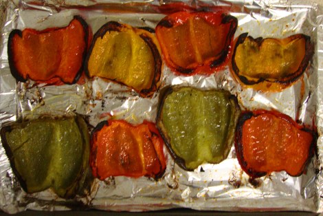 Separate out two tablespoons of olive oil and brush the peppers with it on both sides. Stick them in the oven for about 30-40 minutes turning every 15 minutes or so until they are nicely charred.