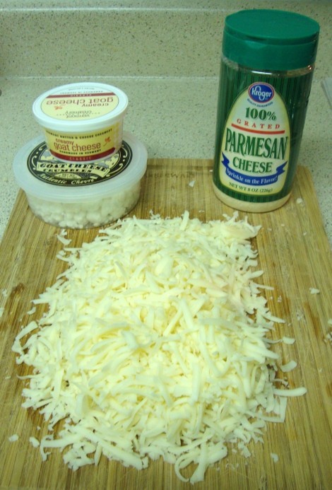 Combine mozzarella, crumbled and creamy goat cheese, Parmesan cheese and tomatoes.