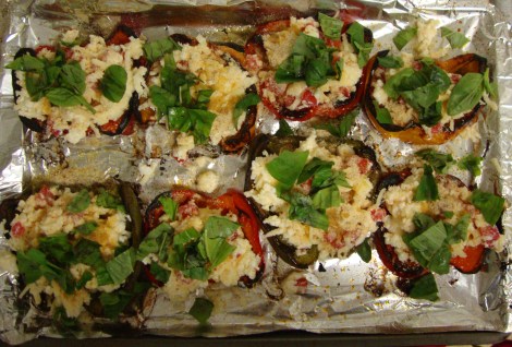 Roasted Bell Peppers Stuffed with Goat Cheese, Mozzarella and Tomatoes
