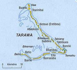 Tarawa, the capital of Kiribati, is an atoll, which is defined as a coral island consisting of a reef surrounding a lagoon.